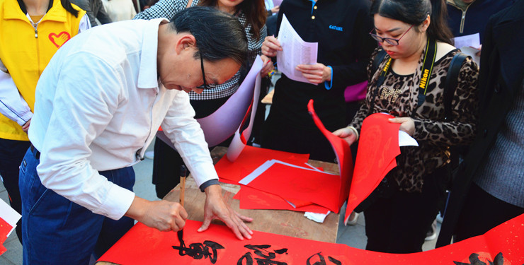 活动现场春潮涌动,气氛十分热烈。来自市书法协会、市工艺美术行业协会的名家,文学院书法专业、美术学院书画专业的师生挥毫泼墨,以各式笔体书写楹联和“福”字。不少师生员工认真观摩书法家的书写,求教技艺,切磋研习,并展示获赠的春联和“福”字,感受喜庆吉祥。