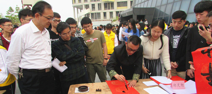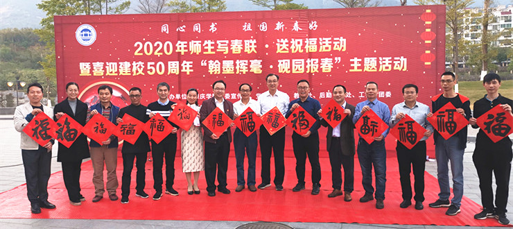 “同心同书,祖国新春好。”1月10日,翰墨池波光潋滟,清风阵阵,伴随着喜气洋洋的乐曲,2020年师生写春联、送祝福活动在湖畔的艺术中心广场举行。活动由党委宣传部、统战部、教务处、后勤处、工会、团委联合主办,文学院、美术学院、音乐学院承办,并得到市书法家协会、市工艺美术行业协会的大力支持。校内外书法家、书法专业师生现场挥毫,表达祝福。