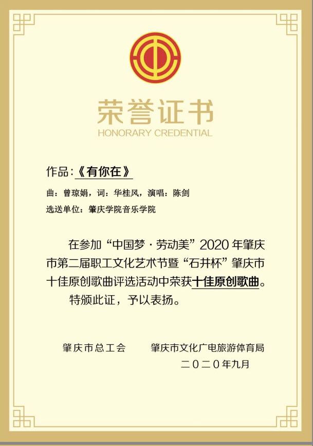 肇庆市第二届职工文化艺术节从2020年4月启动,历时6个月,设置了征文、演讲、十佳原创歌曲评选、十佳文艺节目评选、书画摄影、吉他弹唱大赛等6个项目。在此次活动中,我校各分工会组织教职工积极参与,校工会严格筛选后选送了100多份作品参赛。经过激烈的角逐,我校教职工在艺术节中斩获佳绩。其中,美术学院分工会的余一军老师获书画比赛美术类一等奖,美术学院分工会的侯以方老师获书画比赛美术类二等奖;美术学院分工会的李刚老师获书画比赛书法类二等奖;音乐学院分工会的苗业姝等老师获最佳作曲奖;音乐学院分工会的曾琼娟等老师获十佳原创歌曲奖;体育学院分工会的罗珅老师获十佳职工文艺节目奖。