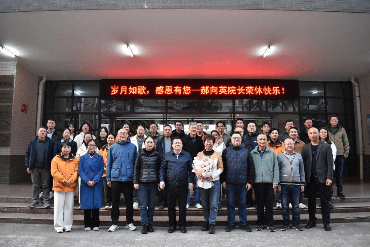 郝向英教授衷心感谢学院的培养与同仁的支持,表示虽告别岗位,仍将心系学院,愿继续为学科建设贡献智慧与力量。座谈会最后,学院领导向郝教授献上鲜花,全体合影留念,定格这温馨而庄重的时刻。