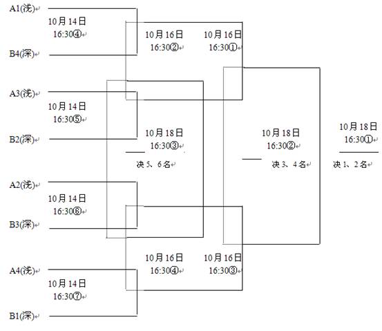 1.对照对阵表安排,队名后面的深、浅,穿相应的深、浅色队服。