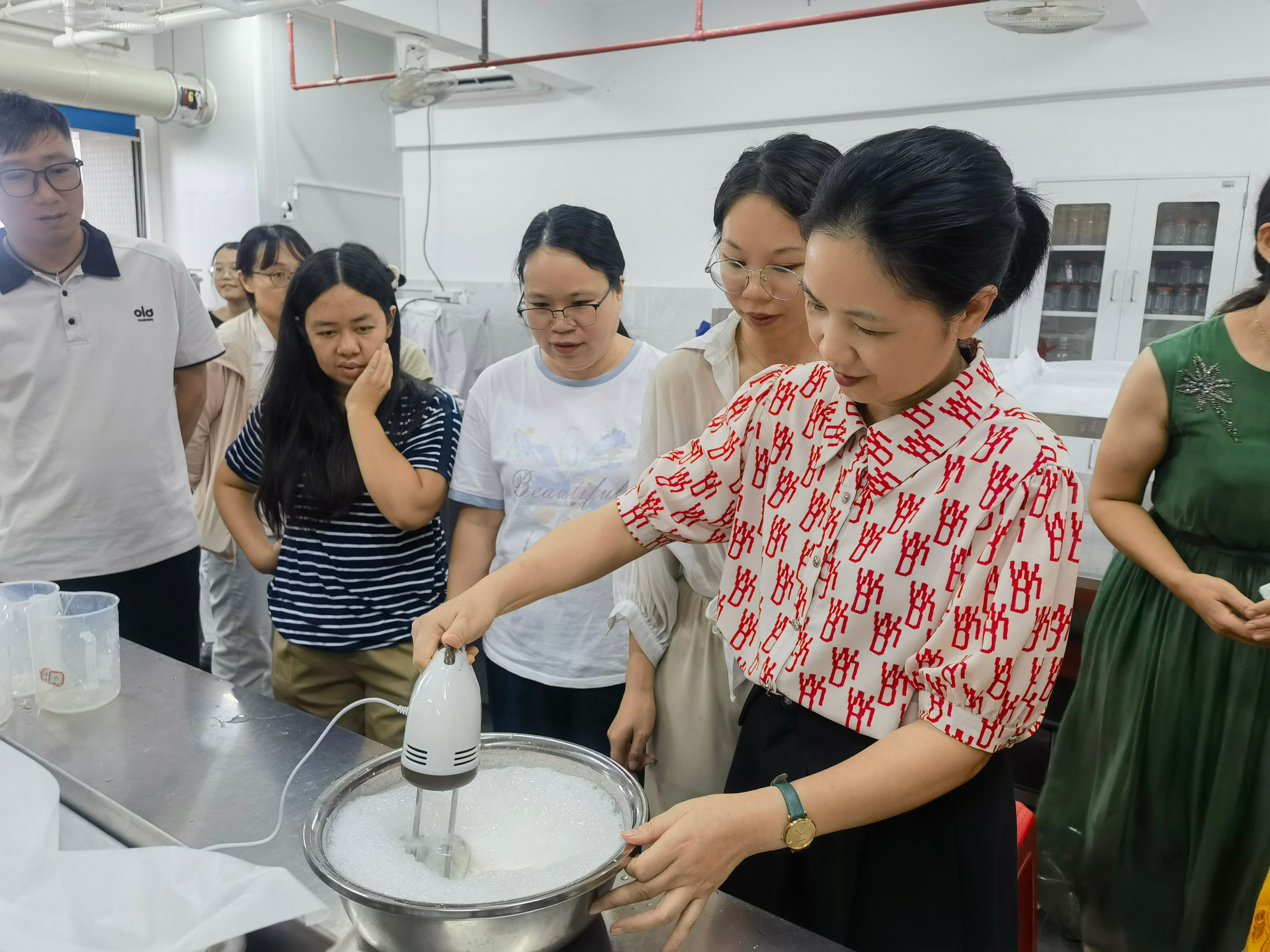 活动现场,指导教师结合实操演示,细致讲解了蛋挞制作的食材配比、关键步骤与注意事项。随后,教职工们进入动手实践环节,称量食材、搅拌蛋液、填充挞皮,操作过程中不时交流制作技巧、分享烘焙心得,现场氛围热烈而温馨。在等待蛋挞烘烤的间隙,各分工会教职工代表展开了轻松愉快的交流,一起探讨工会活动组织的新思路,为今后分工会之间的联动协作奠定了良好基础。