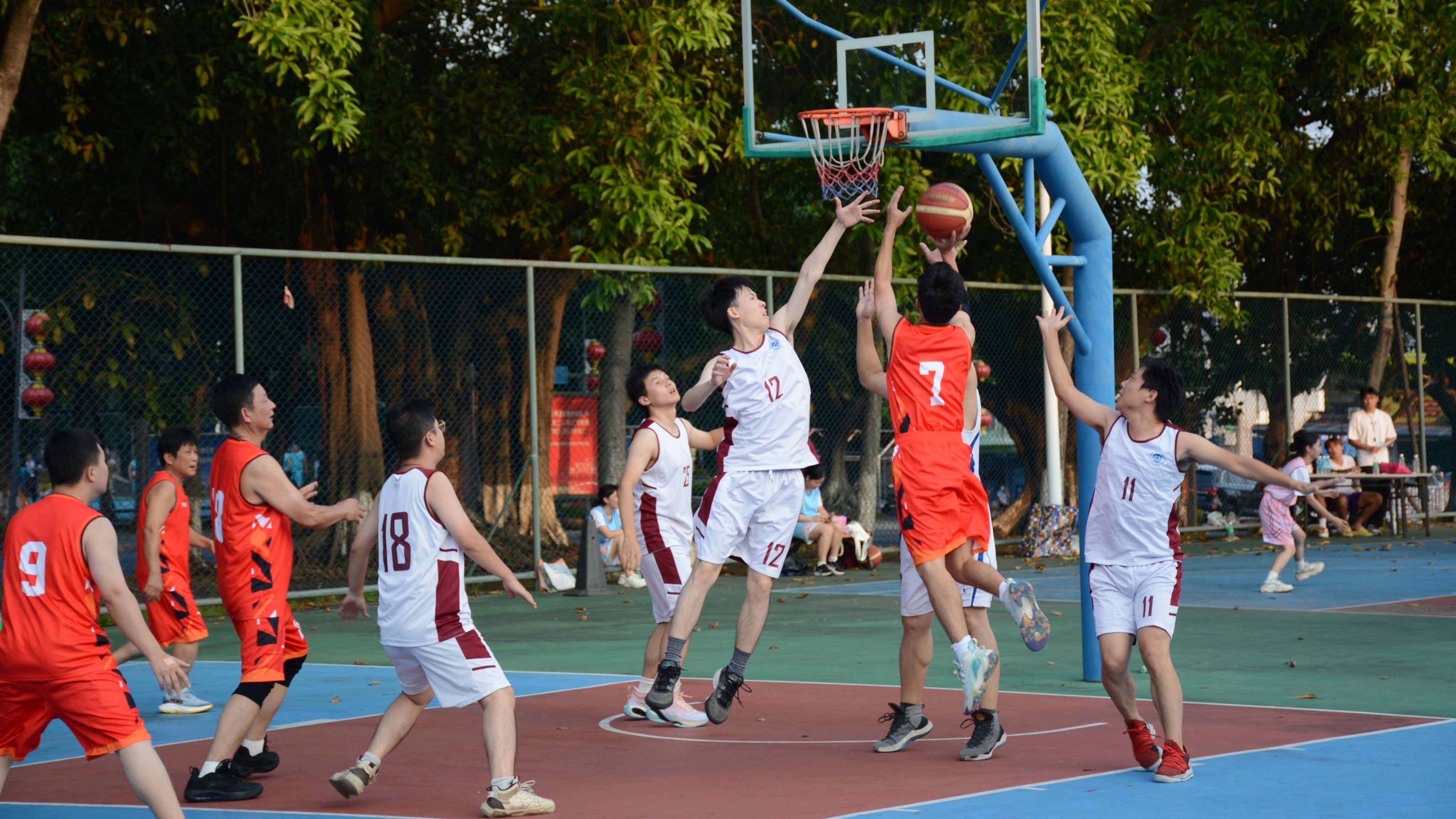 比赛分为男子赛事和女子赛事,男子赛事采用五人赛制,分甲、乙两组进行,女子赛事则采取三人赛制,不设分组。赛场上,球员们配合默契,传球、运球、投篮动作行云流水,精准三分、巧妙抢断与快攻反击轮番上演,激烈对抗中尽显拼搏精神,赢得了观众的阵阵欢呼和掌声。