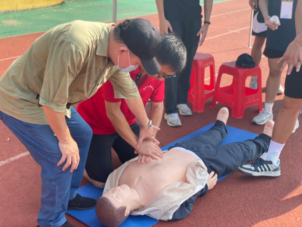 演练现场,体育学院专业教师和工作人员向参加者详细讲解了异物堵塞呼吸道救治方法、脚踝扭伤救治方法、心肺复苏救治方法等运动损伤应急处置方法,并作了正确的演示指导动作。参加者在工作人员的带领下通过实操模拟处理流程,更加有效地掌握运动损伤应急处置的要领和方法。
